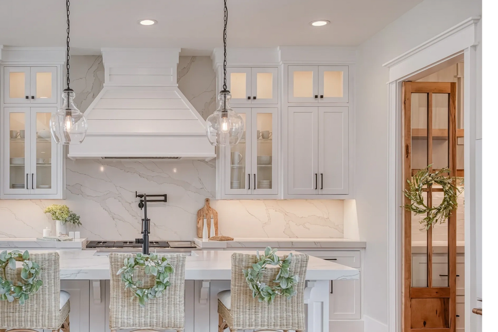 L&M Homes hand-crafted kitchen cabinets with beautiful quartzite countertops and timeless design features